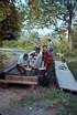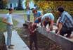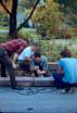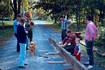 Of course the job isn't done until you clean up the mess (mess = old bridge). Since Lyle Newcomb really wanted to be there to help (but couldn't due to another appointment), it was decided either that (1) we better put the old bridge on his driveway so he'd know the job was done and didn't go running off to get his power tools ready, or (2) he would think it a "hoot" that we left him the old bridge to disemble (I think this was it). Whatever the rationale, he inherited a bunch of firewood. That evening he started the task with his chainsaw - it being the only way he could get into his garage. I never heard, but I suspect he didn't think it was quite as funny as the crew did. |